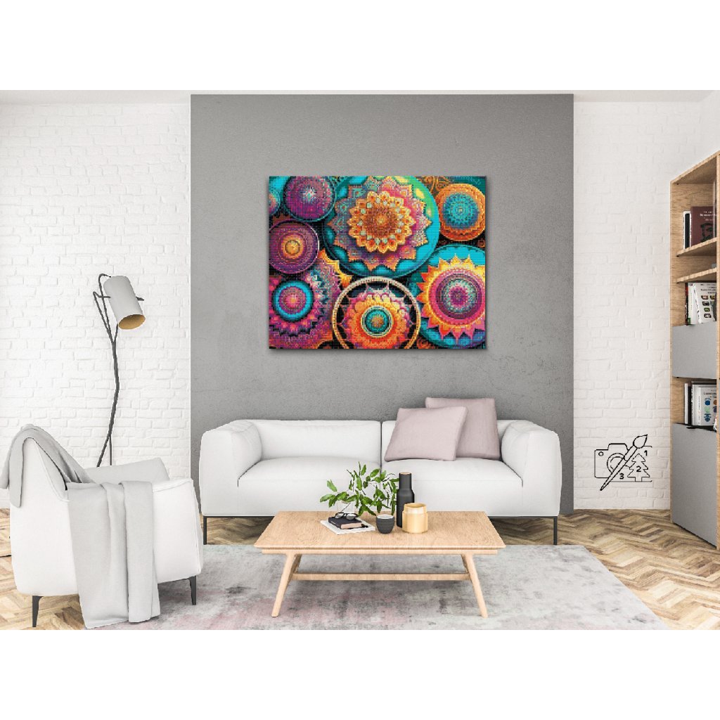 Na plátno budete sázet plastové diamantíky o průměru 2,8mm. Od nás dostanete napytlíčkované všechny potřebné barvy speciálně pro váš obraz. Odstínů různých barev jsou stovky až tisíce, díky čemuž je výsledný obraz prakticky dokonalý. Každý pytlíček obsahuje jednu konkrétní barvu/odstín a je označen číslem, nebo symbolem. Celé plátno pokrývají stovky symbolů a na ně pokládáte barevné diamanty, které stejnému číslu, nebo symbolu svým označením odpovídají. Nemusíte se bát, že byste diamantů měli málo. Množství v pytlíčku je velkorysé a u každého odstínu je ho dostatečná rezerva.